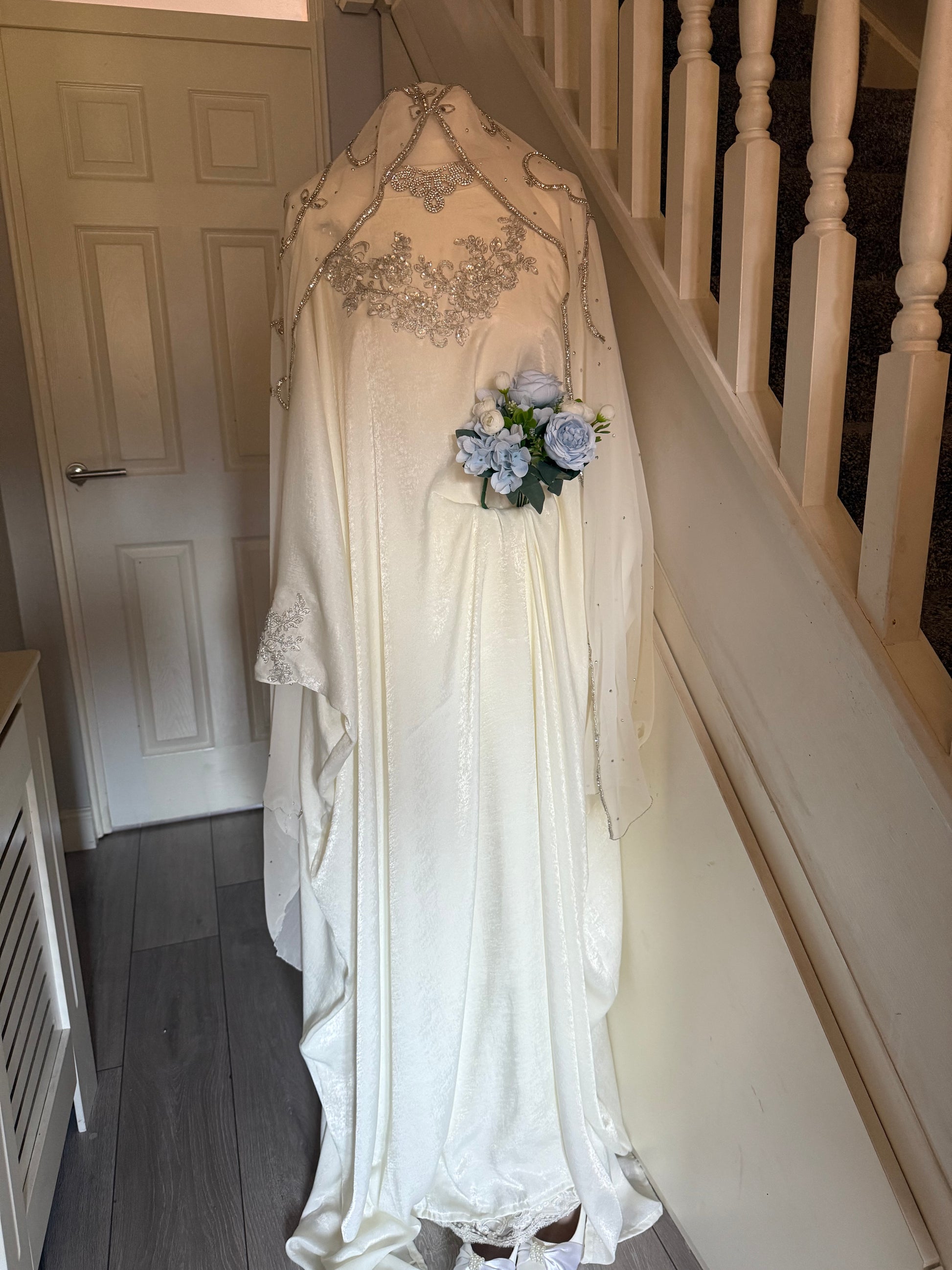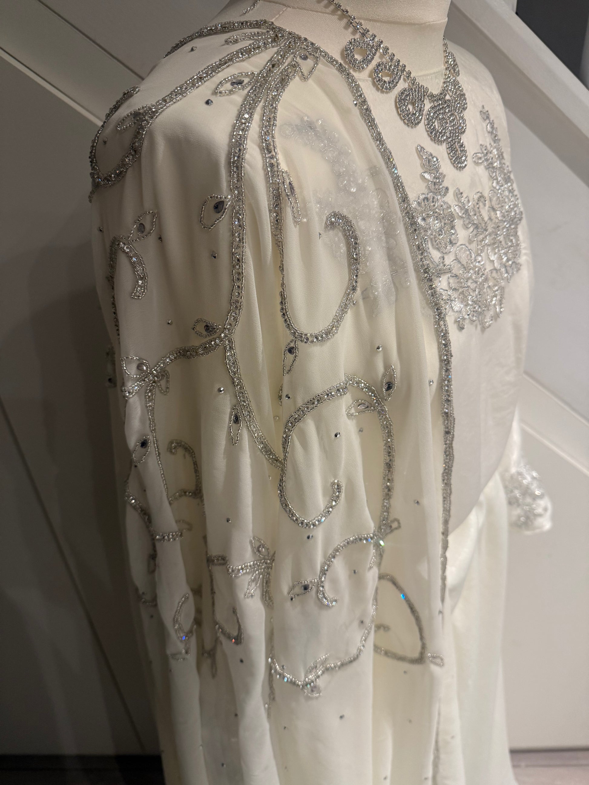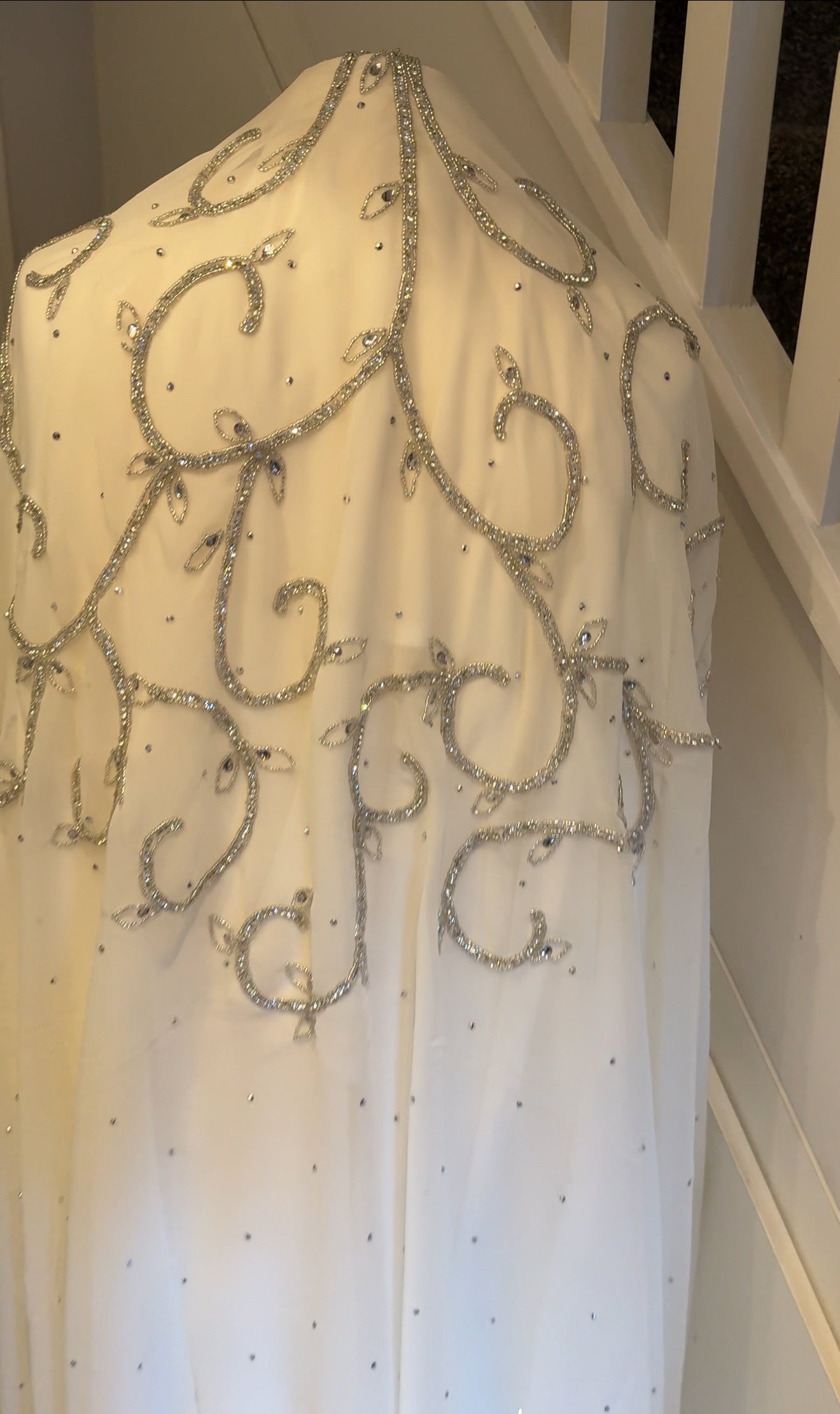 Transform into a vision of timeless elegance with this gorgeous luxury nikkah dirac. This stunning and modest ceremonial dirac is handcrafted with intricate diamond embellishments. The Dirac material is made from a fine velvet satin fabric that is soft, non-iron and beautiful.
